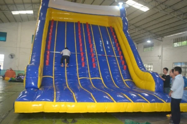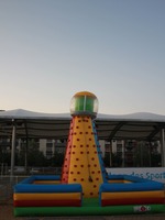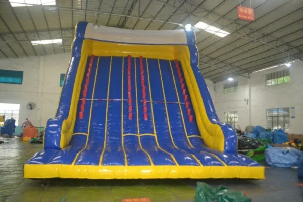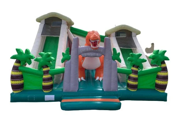 Structure gonflable regroupant toboggan, trampoline et muret à grimper.