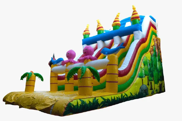 Ce superbe toboggan dispose d’une rampe montante sur la droite de la structure avec des marches permettant à ses utilisateurs e se rendre au sommet pour découvrir une piste descendante.